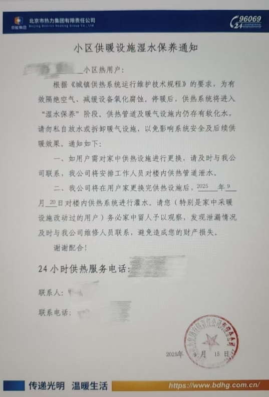 “2025年9月20日,对楼内供热系统来进行灌水,请您务必家中留人予以观察……”9月15日,家住海淀区甘家口街道的曲先生发现,业主群内贴出了一张“小区供暖设施湿水保养通知”。在通知中,为该小区提供供热服务的北京市热力集团提示小区居民,在楼内供热系统灌水过程中,居民一经发现泄漏情况,可及时与公司修东西的人联系。也请居民不要私自放水或拆卸暖气设施,以免影响系统安全及后续供暖效果。